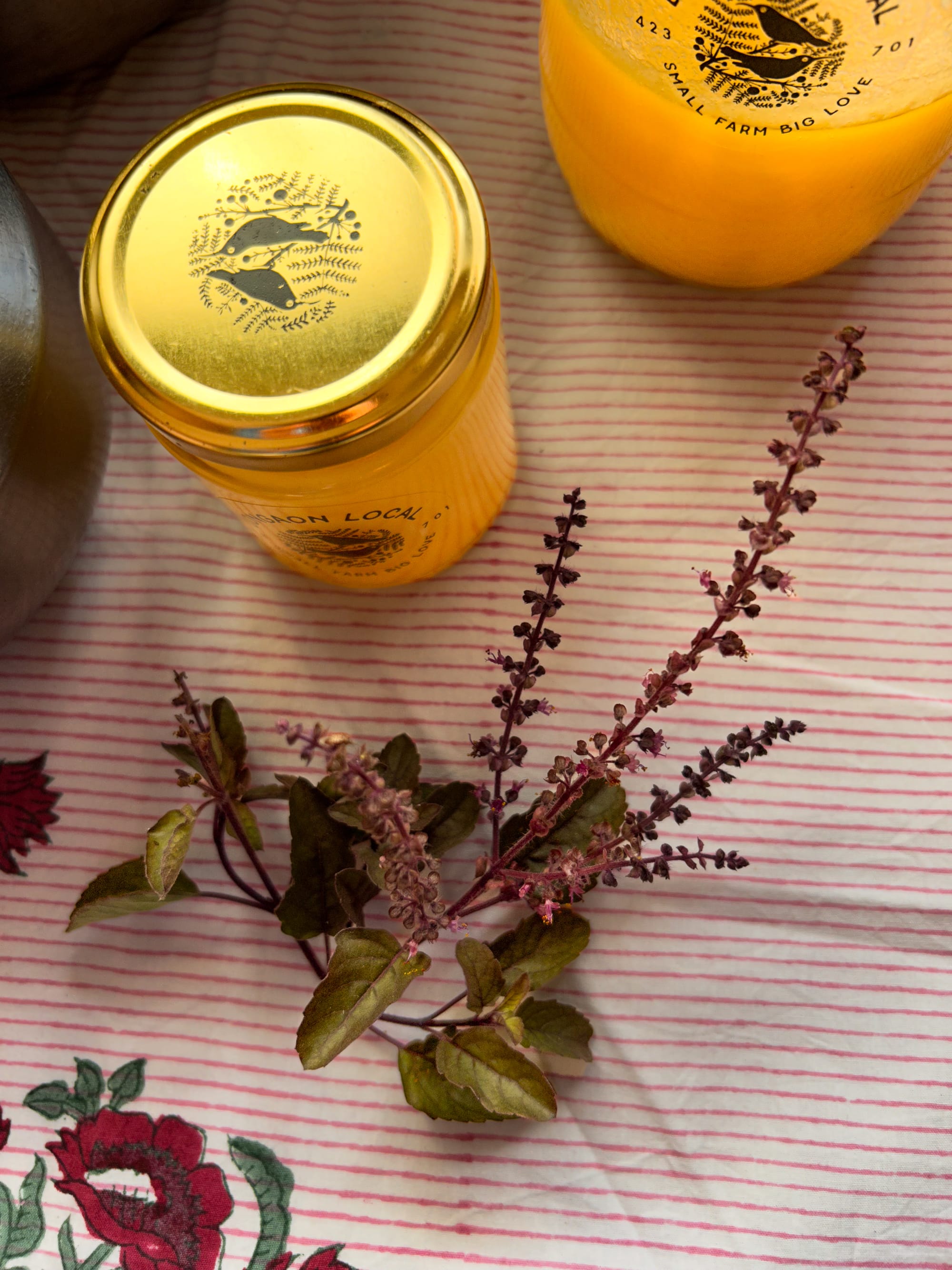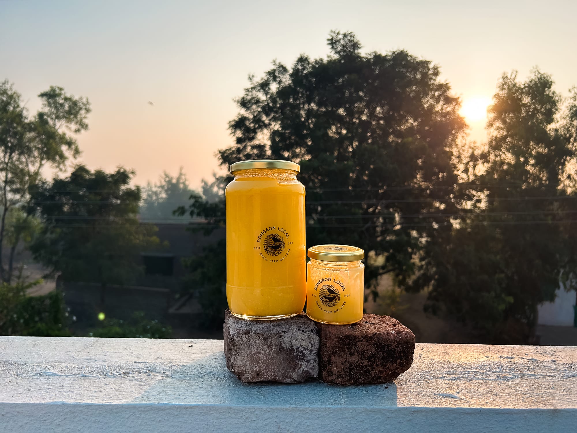 The ghee that reaches you is made with love from the milk of Chandrika, Radha, Ekadashi and Tambdi, cows on the farm, only after they are done feeding their calves.