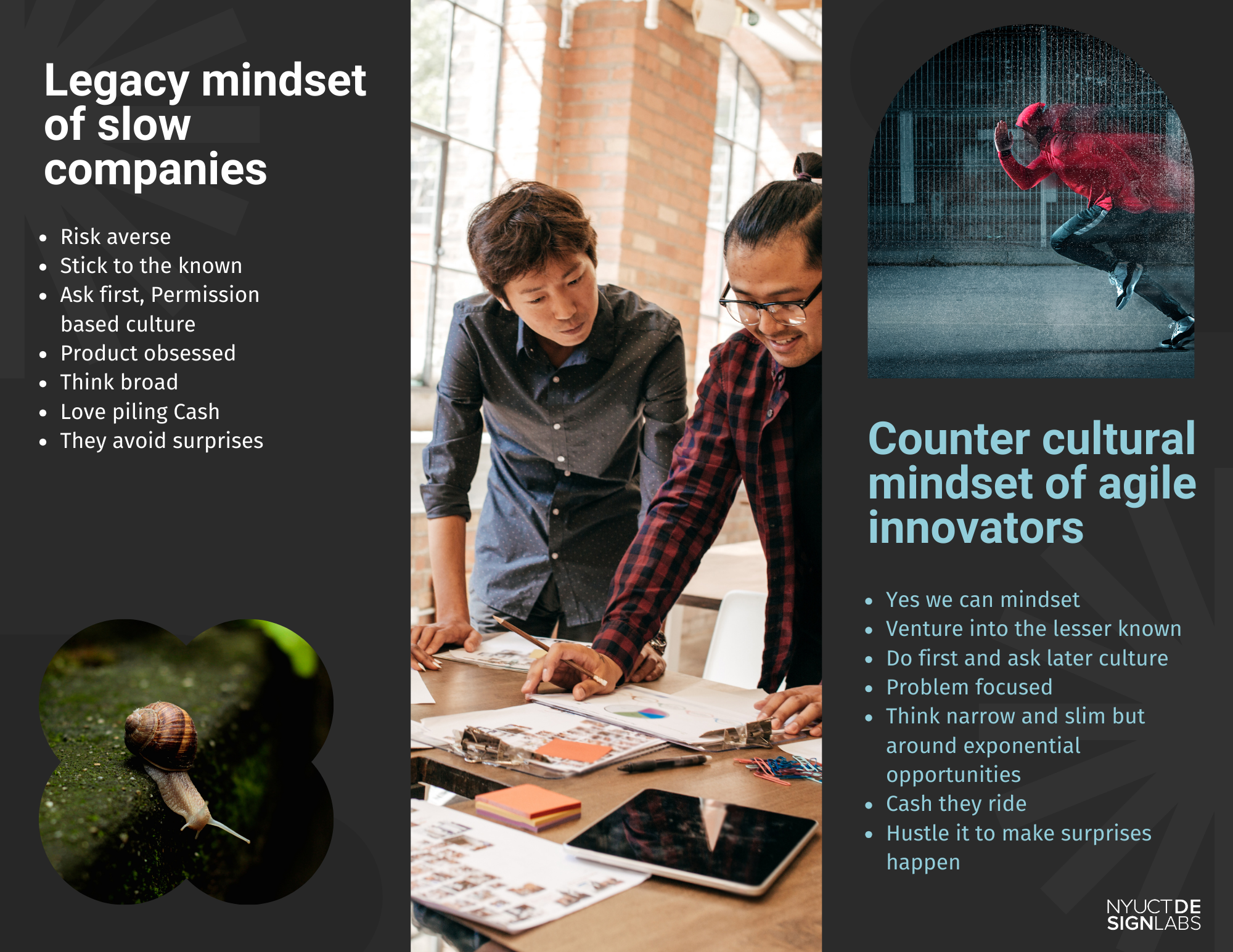 An entrepreneurial culture, a growth by innovation mindset and a design thinking spirit can help. In short, a venture design culture can help. There are simple hacks and frameworks that can help businesses that are traditional, conservative and less agile to recover their agility and innovative streak. These techniques and routes should be seen as extremely reasonable investments to unlock massive capital for the future.